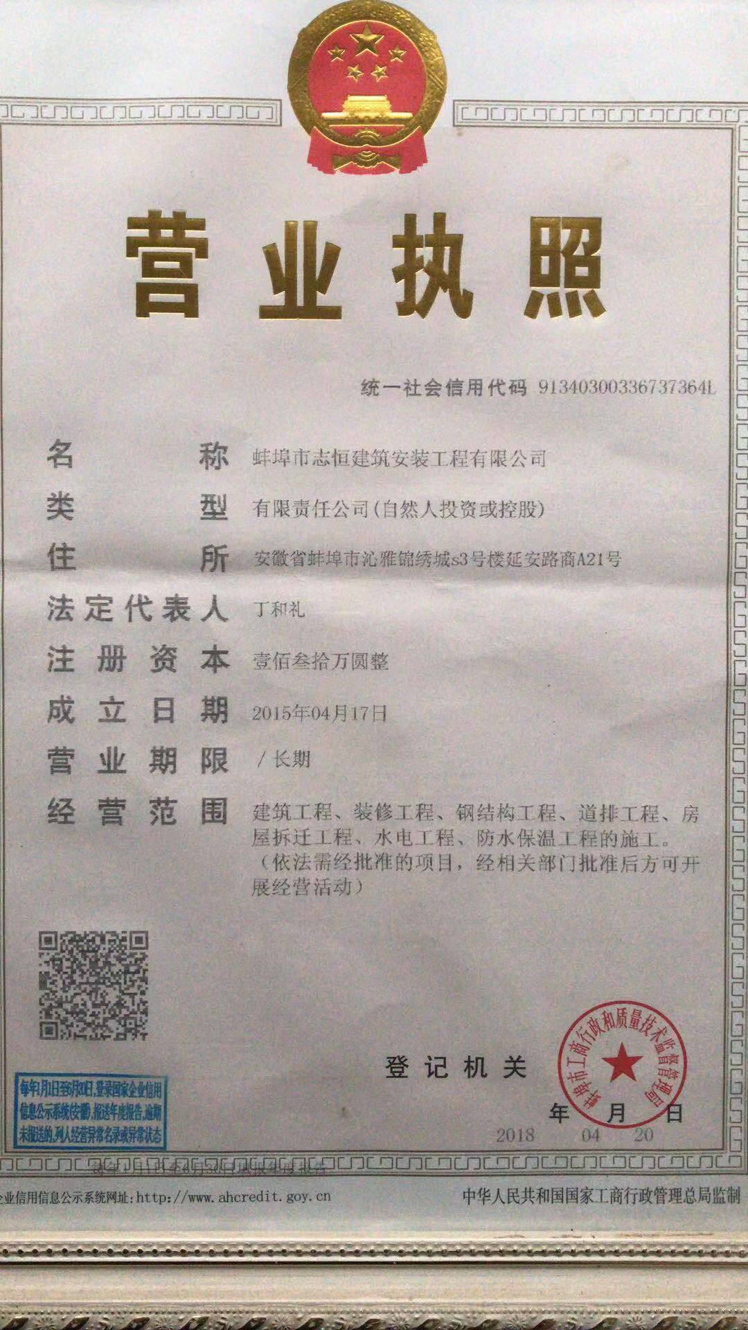 蚌埠志恒建筑安裝工程有限公司營業(yè)執(zhí)照